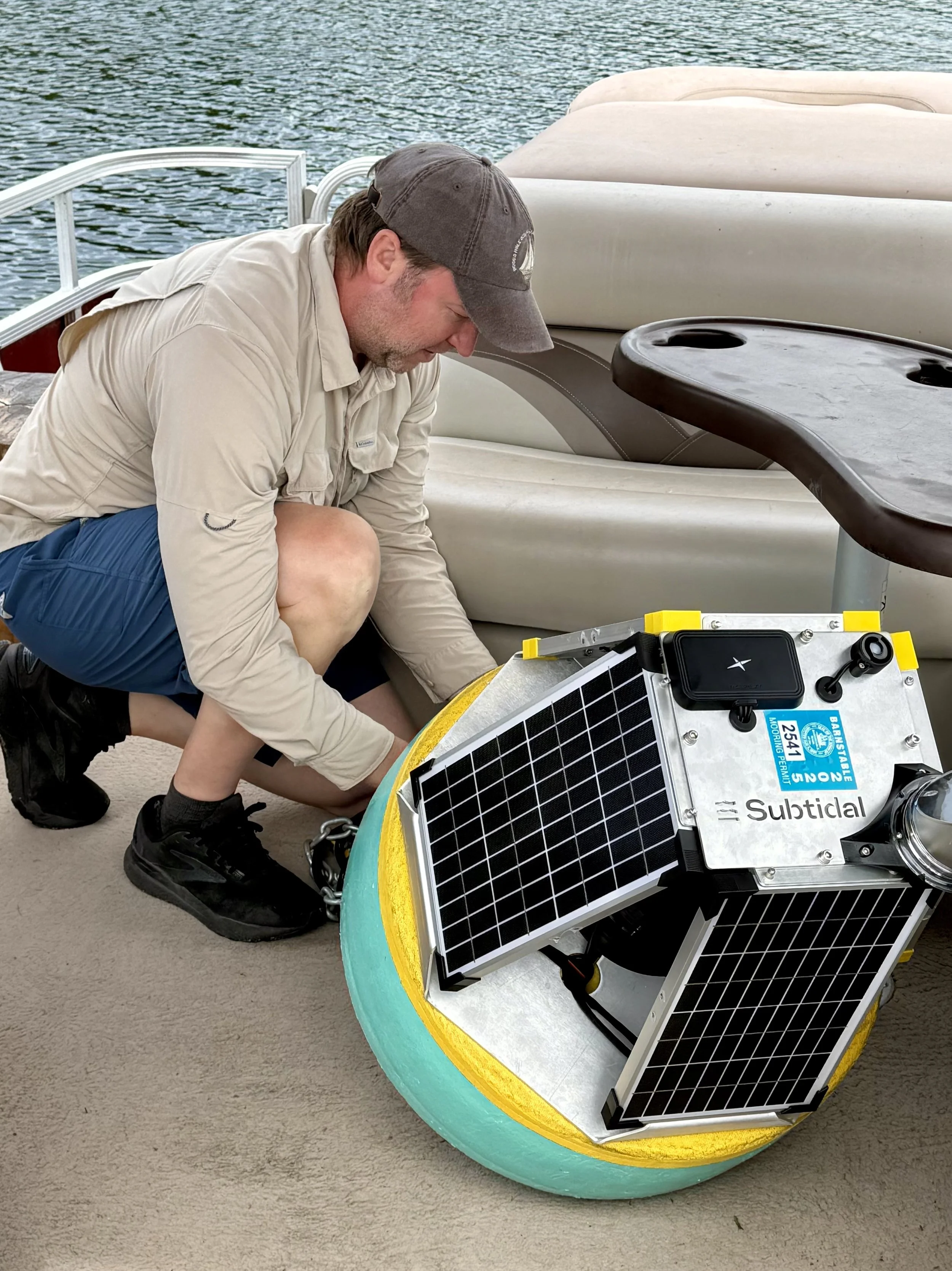 Subtidal Co-Founder and Chief Scientific Officer Matt Long put the buoy in the water today, and activated it to begin collecting and transmitting data. We will soon have access to an online dashboard with real-time water condition data, which will enable us to respond more quickly to changes in our cyanobacteria levels.